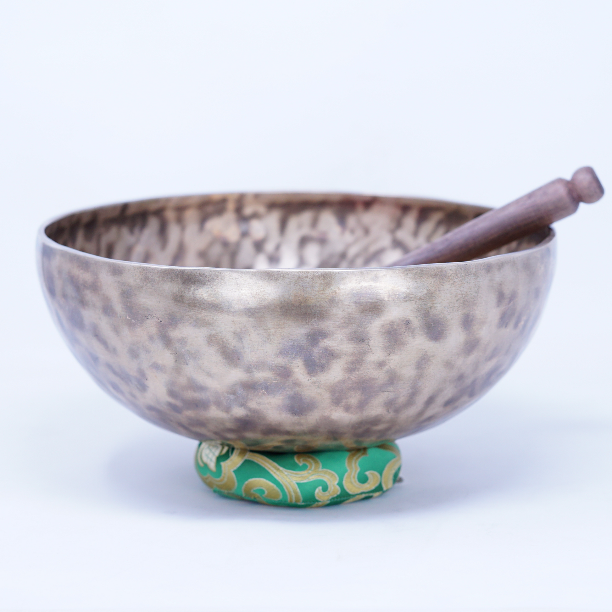 Every Tiger Skin  singing bowl is truly one of a kind, featuring a completely hand-hammered construction from raw materials and uniquely intricate Tiger Skin design that naturally occurs during the hand hammering process. The craftsmanship and design combine to create an exceptional piece that will not disappoint. When struck, the bowl emits a soothing and serene sound that can help you reach a state of inner peace. Whether you are new to meditation or a seasoned practitioner, this singing bowl is the perfect addition to your practice, offering a sense of tranquility and calm to your daily routine.